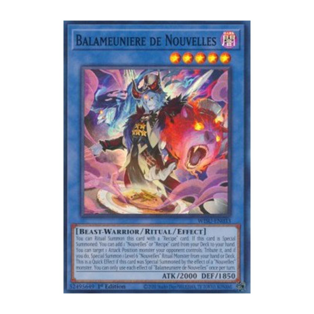 Vous pouvez Invoquer Rituellement cette carte avec une carte "Recette". Si cette carte est Invoquée Spécialement : vous pouvez ajouter 1 carte "Nouvelles" ou "Recette" depuis votre Deck à votre main. Vous pouvez cibler 1 monstre en Position d'Attaque contrôlé par votre adversaire ; Sacrifiez-le, et si vous le faites, Invoquez Spécialement 1 Monstre Rituel "Nouvelles" de Niveau 6 depuis votre main ou Deck. Ceci est un Effet Rapide si cette carte a été Invoquée Spécialement par l'effet d'un monstre "Nouvelles". Vous ne pouvez utiliser chaque effet de "Balameunière de Nouvelles" qu'une fois par tour.