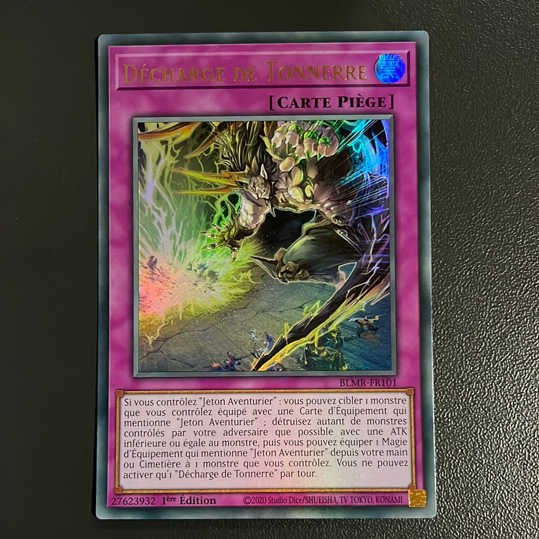 Si vous contrôlez "Jeton Aventurier" : vous pouvez cibler 1 monstre que vous contrôlez équipé avec une Carte d'Équipement qui mentionne "Jeton Aventurier" ; détruisez autant de monstres contrôlés par votre adversaire que possible avec une ATK inférieure ou égale au monstre, puis vous pouvez équiper 1 Magie d'Équipement qui mentionne "Jeton Aventurier" depuis votre main ou Cimetière à 1 monstre que vous contrôlez. Vous ne pouvez activer qu'1 "Décharge de Tonnerre" par tour.