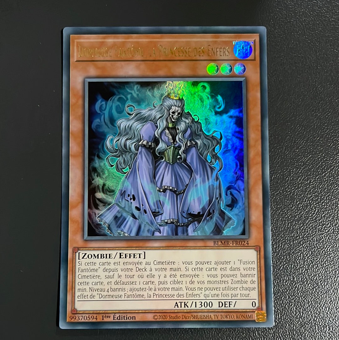 Si cette carte est envoyée au Cimetière : vous pouvez ajouter 1 "Fusion Fantôme" depuis votre Deck à votre main. Si cette carte est dans votre Cimetière, sauf le tour où elle y a été envoyée : vous pouvez bannir cette carte, et défaussez 1 carte, puis ciblez 1 de vos monstres Zombie de min. Niveau 4 bannis ; ajoutez-le à votre main. Vous ne pouvez utiliser chaque effet de "Dormeuse Fantôme, la Princesse des Enfers" qu'une fois par tour.