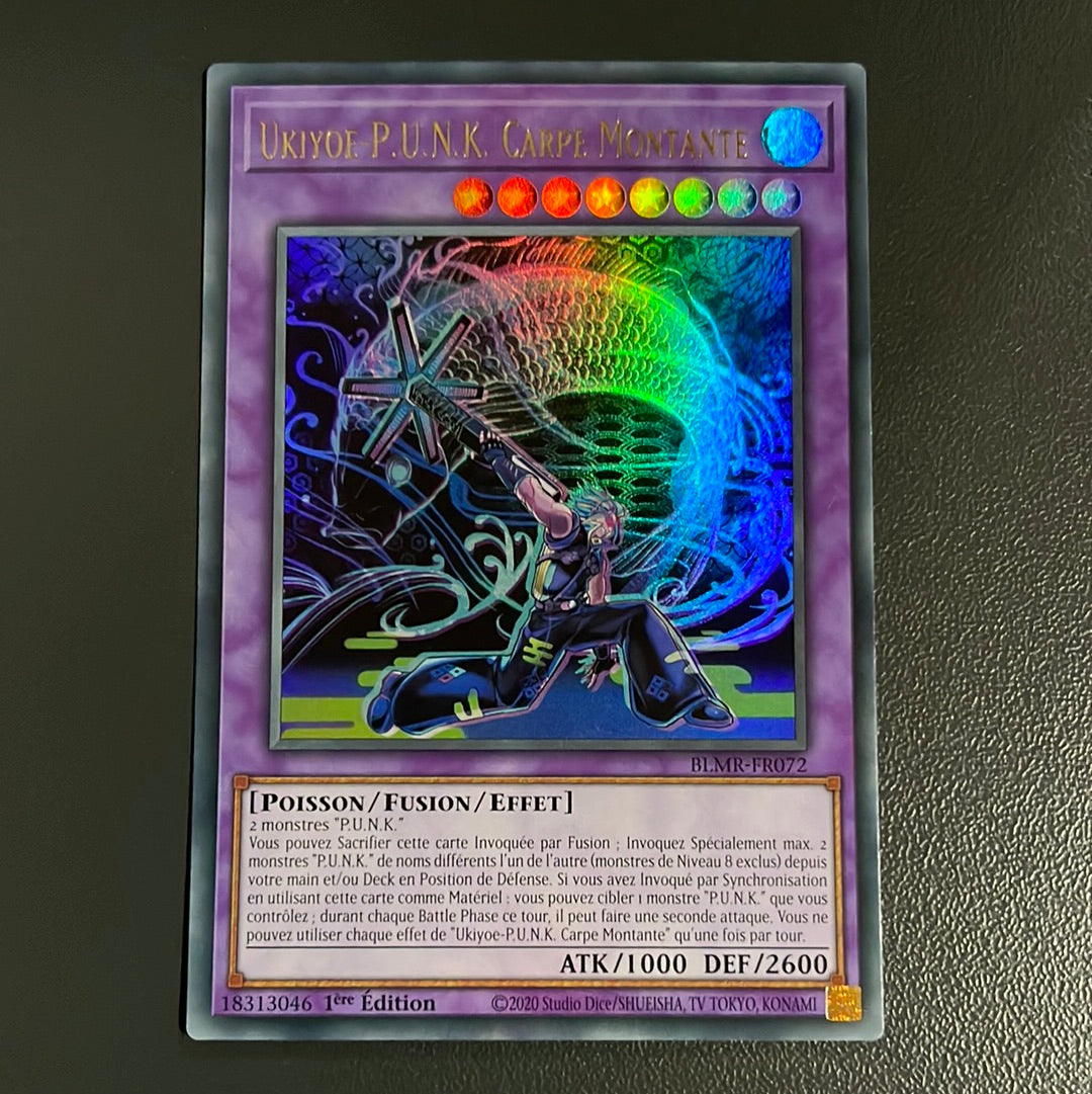 Vous pouvez Sacrifier cette carte Invoquée par Fusion ; Invoquez Spécialement max. 2 monstres "P.U.N.K." de noms différents l'un de l'autre (monstres de Niveau 8 exclus) depuis votre main et/ou Deck en Position de Défense. Si vous avez Invoqué par Synchronisation en utilisant cette carte comme Matériel : vous pouvez cibler 1 monstre "P.U.N.K." que vous contrôlez ; durant chaque Battle Phase ce tour, il peut faire une seconde attaque. Vous ne pouvez utiliser chaque effet de "Ukiyoe-P.U.N.K. Carpe Montante" qu'une fois par tour.