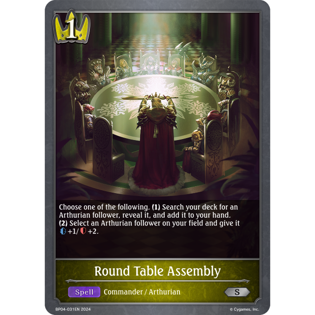 Choose one of the following. (1) Search your deck for an Arthurian follower, reveal it, and add it to your hand. (2) Select an Arthurian follower on your field and give it