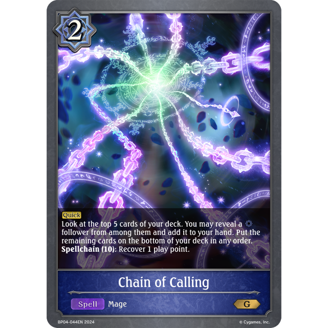 follower from among them and add it to your hand. Put the remaining cards on the bottom of your deck in any order. Spellchain (10): Recover 1 play point.