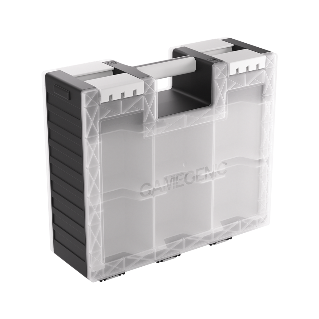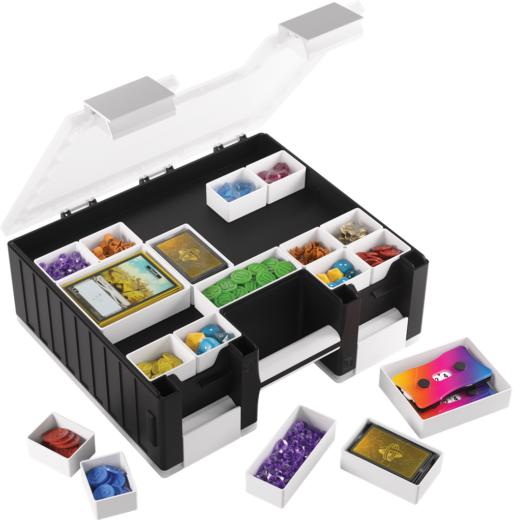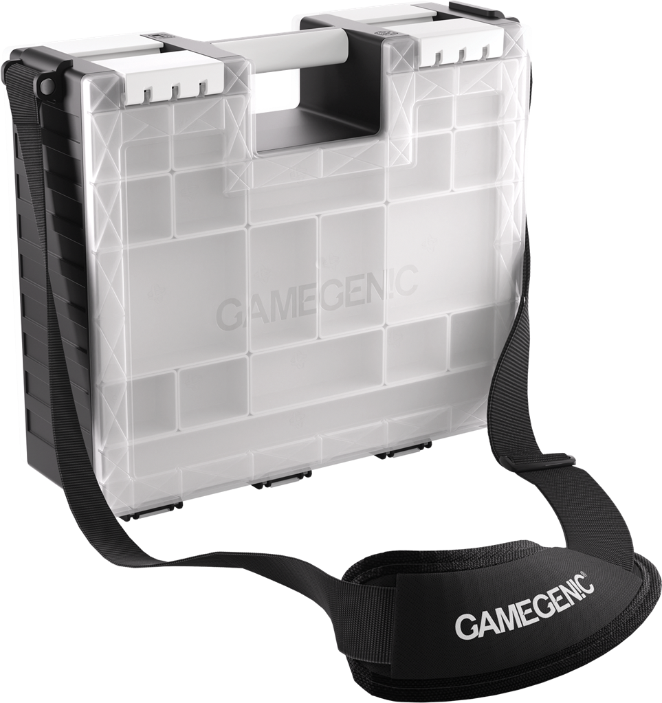 Ce tout nouveau produit peut s’ouvrir des deux côtés, permettant un accès séparé à un grand nombre de cartes et de tokens. Son design innovant offre un stockage sécurisé tout en permettant un transport facile et confortable lors de vos soirées jeux ou tournois, grâce à sa poignée renforcée intégrée et sa bandoulière réglable et détachable.
