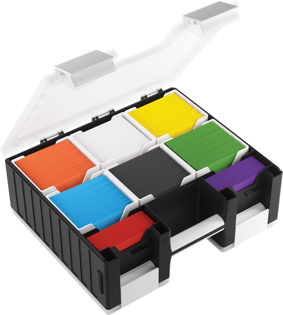 Un côté de la boîte comprend six compartiments amovibles pouvant contenir jusqu’à 600 cartes double-sleeve en Thick Inner Sleeves ou 800 cartes board-game-sleeved.