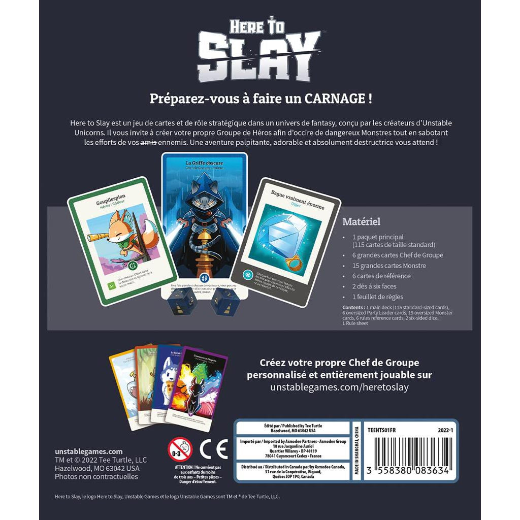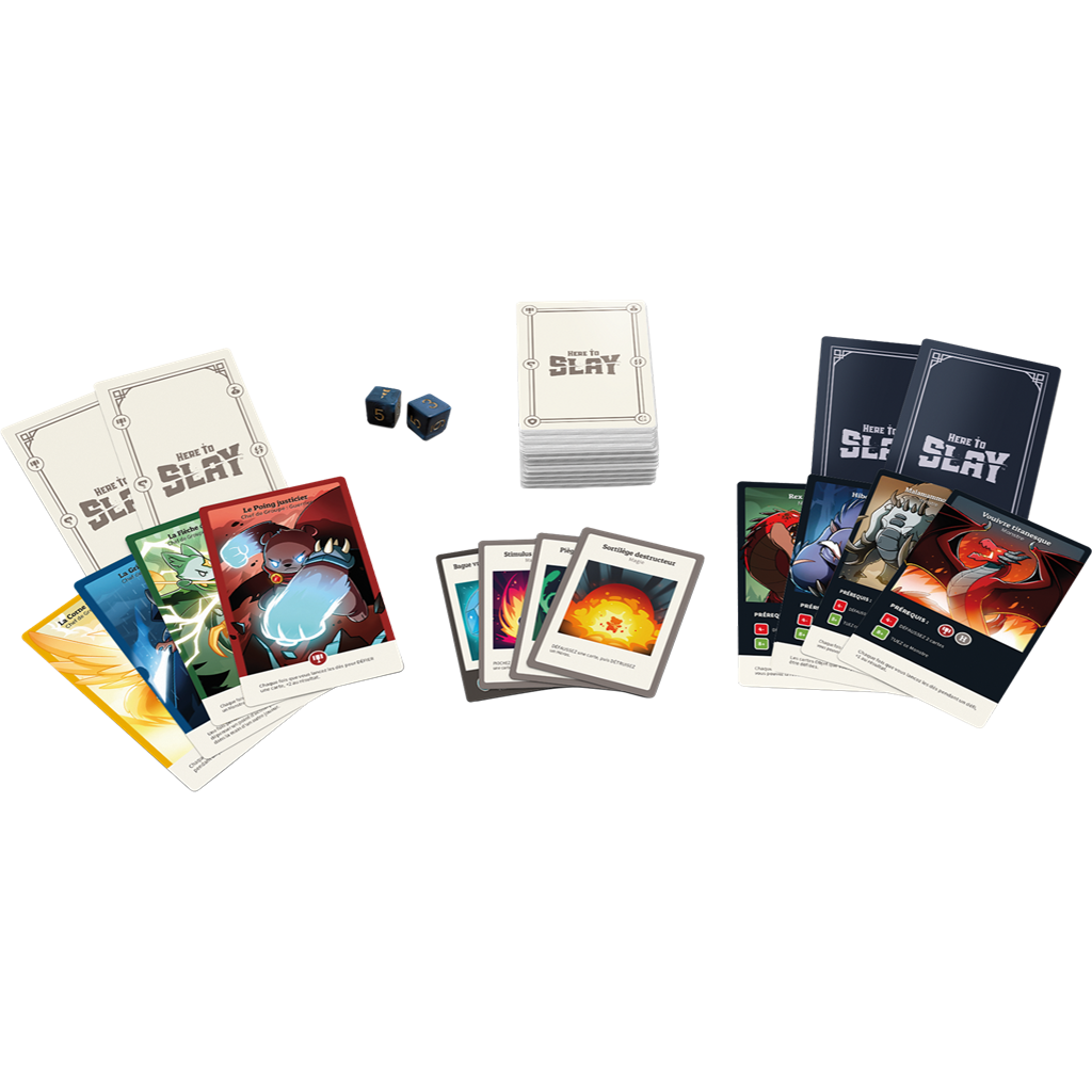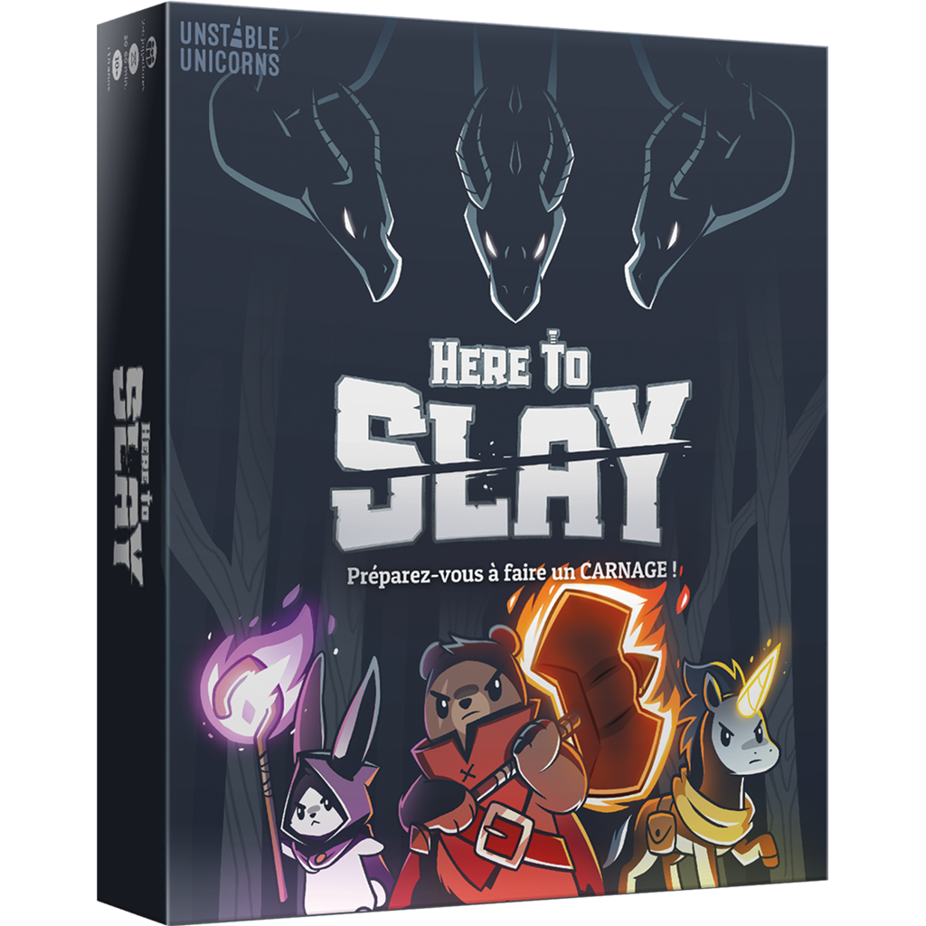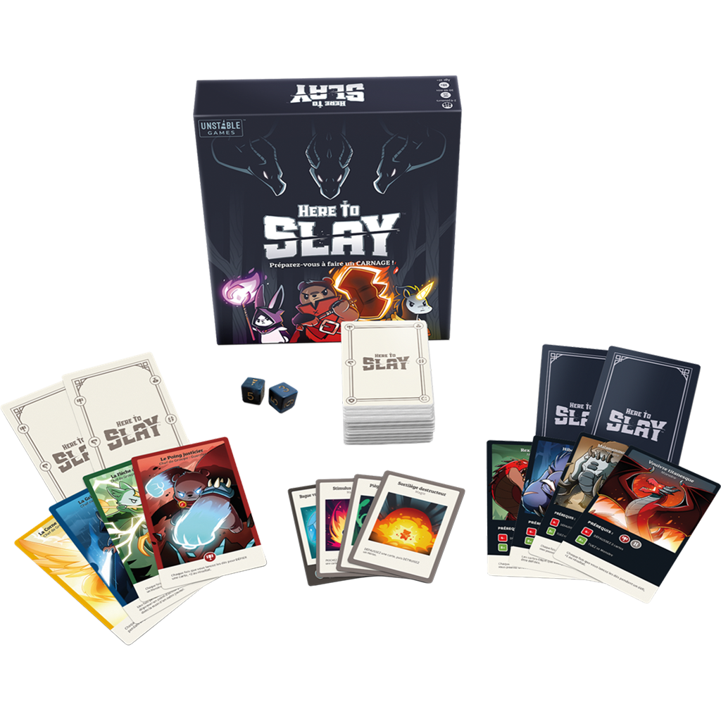 Here to Slay est un jeu de cartes stratégique dans un univers de fantasy, conçu par les créateurs d’Unstable Unicorns. Il vous invite à créer votre propre Groupe de Héros afin d’occire de dangereux Monstres tout en sabotant les efforts de vos concurrents.