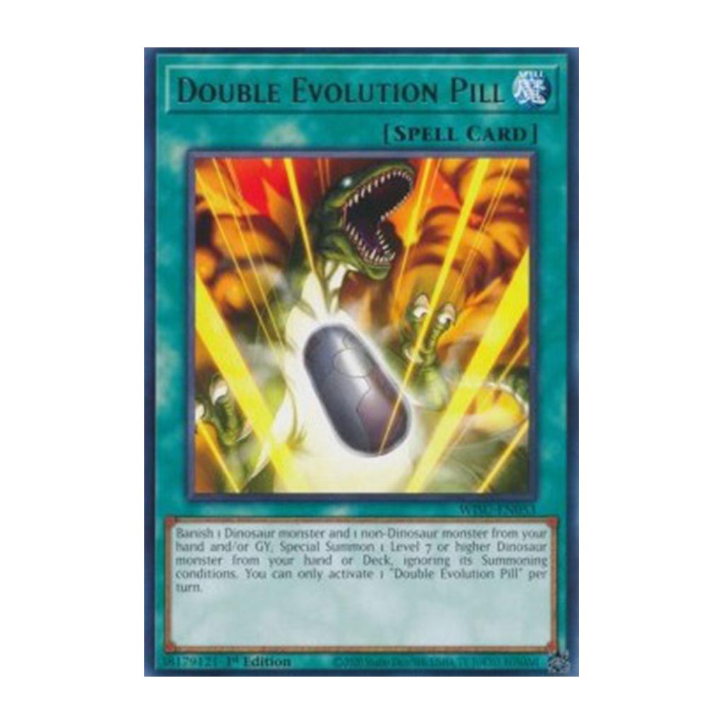Bannissez 1 monstre Dinosaure et 1 monstre non-Dinosaure depuis votre main et/ou Cimetière ; Invoquez Spécialement 1 monstre Dinosaure de min. Niveau 7 depuis votre main ou Deck, en ignorant ses conditions d'Invocation. Vous ne pouvez activer qu'1 "Pilule d'Évolution Double" par tour.