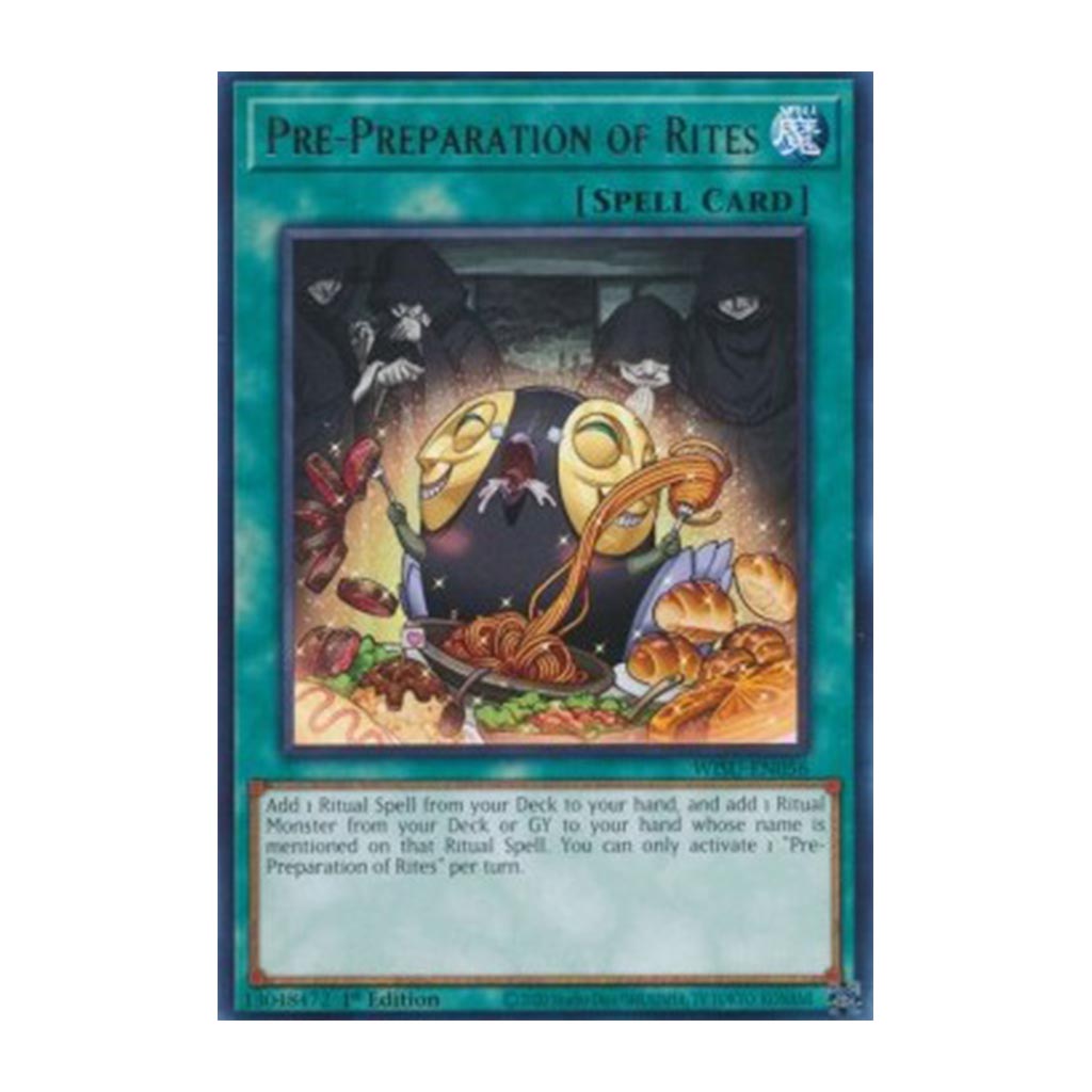 Ajoutez 1 Magie Rituelle depuis votre Deck à votre main, et ajoutez 1 Monstre Rituel dont le nom est mentionné sur la Magie Rituelle depuis votre Deck ou Cimetière à votre main. Vous ne pouvez activer qu'1 "Pré-Préparation des Rites" par tour.