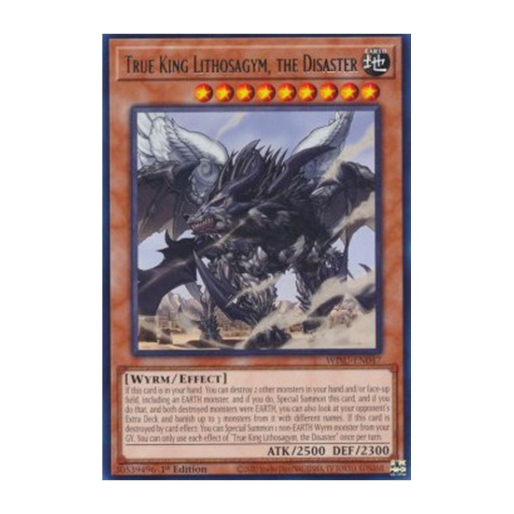 Si cette carte est dans votre main : vous pouvez détruire 2 autres monstres dans votre main et/ou Terrain face recto (un monstre TERRE inclus), et si vous le faites, Invoquez Spécialement cette carte, et si vous faites ça, et que les deux monstres détruits étaient TERRE, vous pouvez aussi regarder l'Extra Deck de votre adversaire et en bannir max. 3 monstres de noms différents. Si cette carte est détruite par un effet de carte : vous pouvez Invoquer Spécialement 1 monstre non-TERRE Wyrm depuis votre Cimetière. Vous ne pouvez utiliser chaque effet de "Roi Véritable Lithosagym le Désastre" qu'une fois par tour.