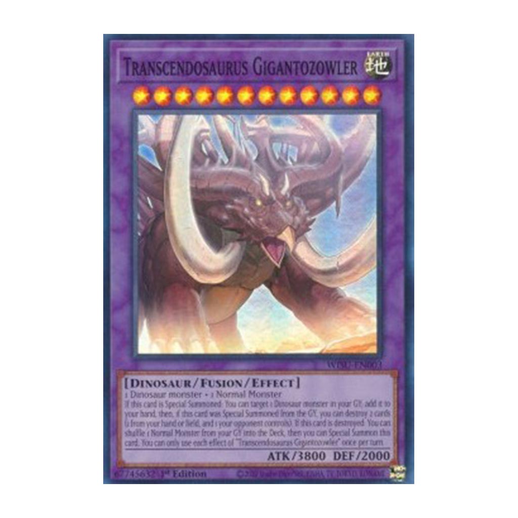 Si cette carte est Invoquée Spécialement : vous pouvez cibler 1 monstre Dinosaure dans votre Cimetière ; ajoutez-le à votre main, puis, si cette carte a été Invoquée Spécialement depuis le Cimetière, vous pouvez détruire 2 cartes (1 depuis votre main ou Terrain, et 1 contrôlée par votre adversaire). Si cette carte est détruite : vous pouvez mélanger 1 Monstre Normal depuis votre Cimetière dans le Deck, puis vous pouvez Invoquer Spécialement cette carte. Vous ne pouvez utiliser chaque effet de "Transcendosaure Gigantozouleur" qu'une fois par tour.