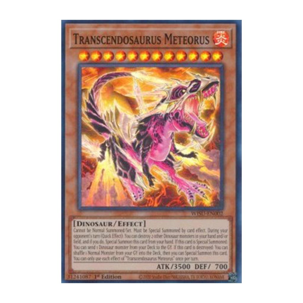 Ni Invocable Normalement ni Posable Normalement. Uniquement Invocable Spécialement par un effet de carte. Durant le tour de votre adversaire (Effet Rapide) : vous pouvez détruire 2 autres monstres Dinosaure dans votre main et/ou sur votre Terrain, et si vous le faites, Invoquez Spécialement cette carte depuis votre main. Si cette carte est Invoquée Spécialement : vous pouvez envoyer 1 monstre Dinosaure depuis votre Deck au Cimetière. Si cette carte est détruite : vous pouvez mélanger 1 Monstre Normal depuis votre Cimetière dans le Deck, puis vous pouvez Invoquer Spécialement cette carte. Vous ne pouvez utiliser chaque effet de "Transcendosaure Météoraure" qu'une fois par tour.